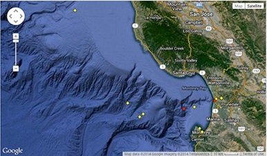 At the NOAA, National Data Buoy Center web site, you will see the large map shown above (top). As an example, we have zoomed in on Monterey Bay, California shown in this image. We chose a data buoy straight out above the Monterey Sea Canyon and we clicked on it’s Yellow Icon.